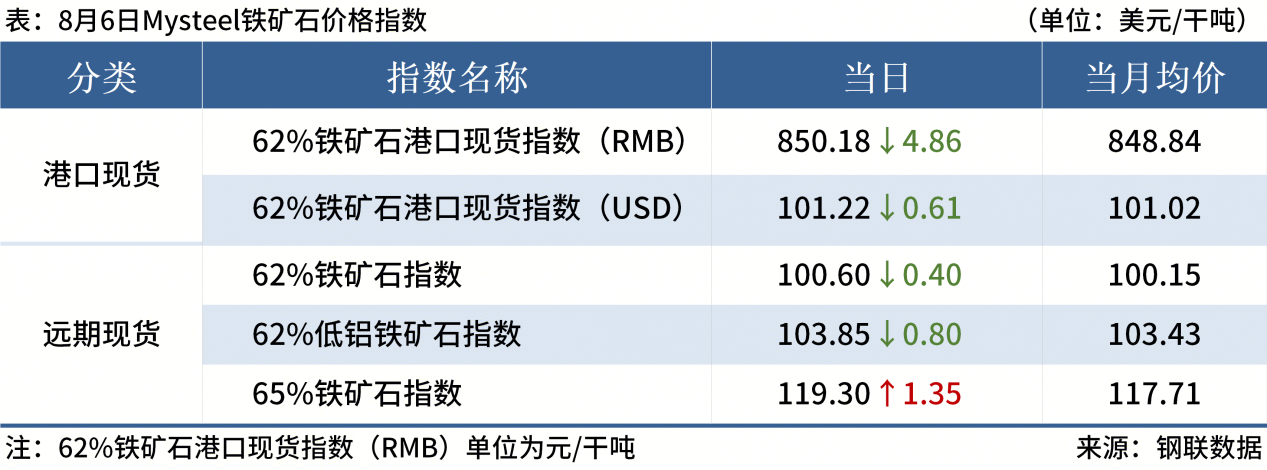 ◎ 8月6日,全國主港鐵礦石成交106.70萬噸,環(huán)比增6%;237家主流貿(mào)易商建筑鋼材成交10.62萬噸,環(huán)比減3.5%。