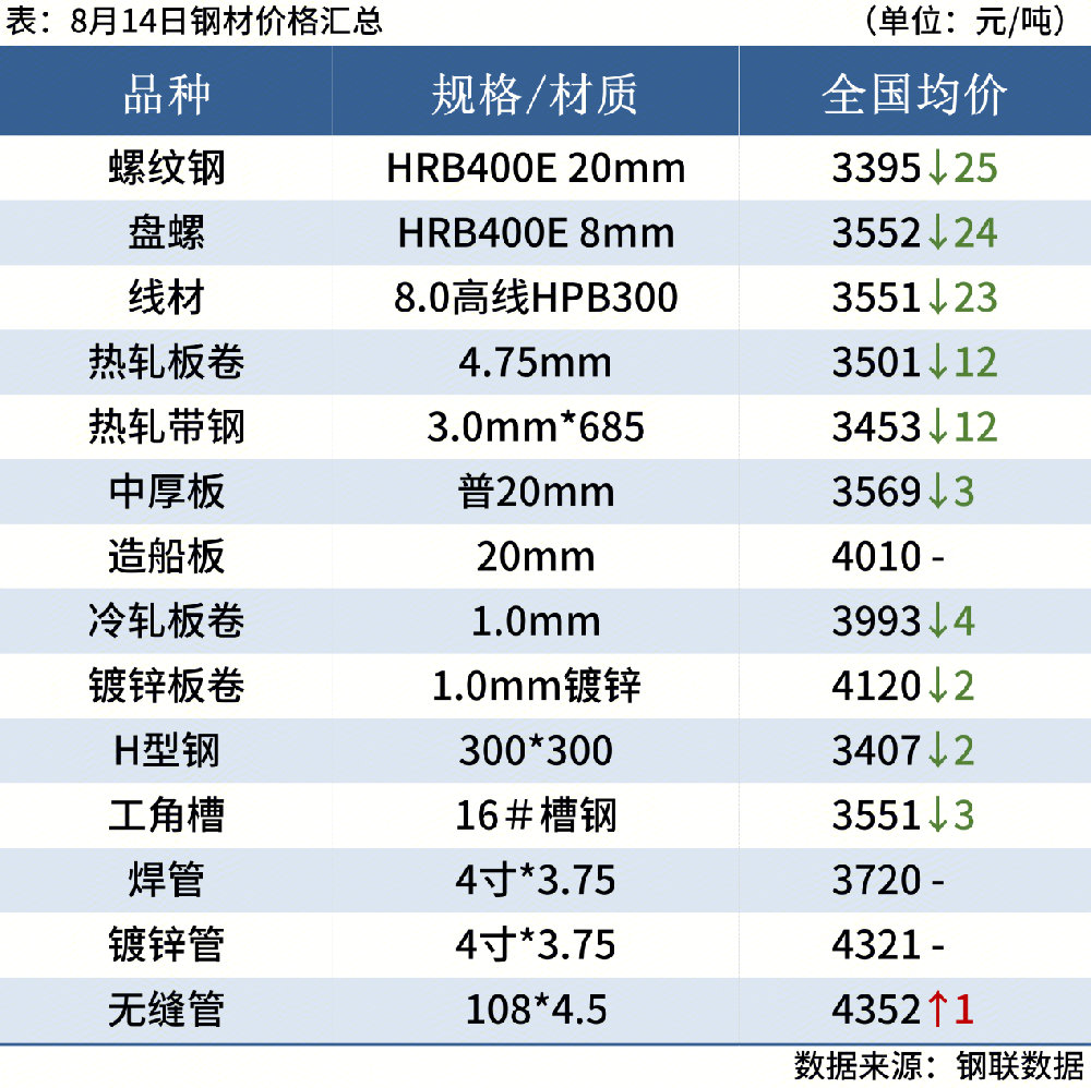 8月14日,國(guó)內(nèi)鋼材震蕩偏弱,唐山遷安普方坯出廠含稅價(jià)跌20報(bào)3060元/噸。成交方面,上午市場(chǎng)整體成交一般,午后期螺加速回落,現(xiàn)貨市場(chǎng)低價(jià)資源涌現(xiàn),交投氛圍冷清。