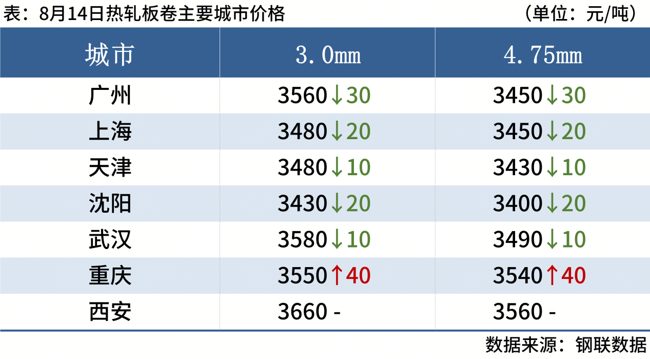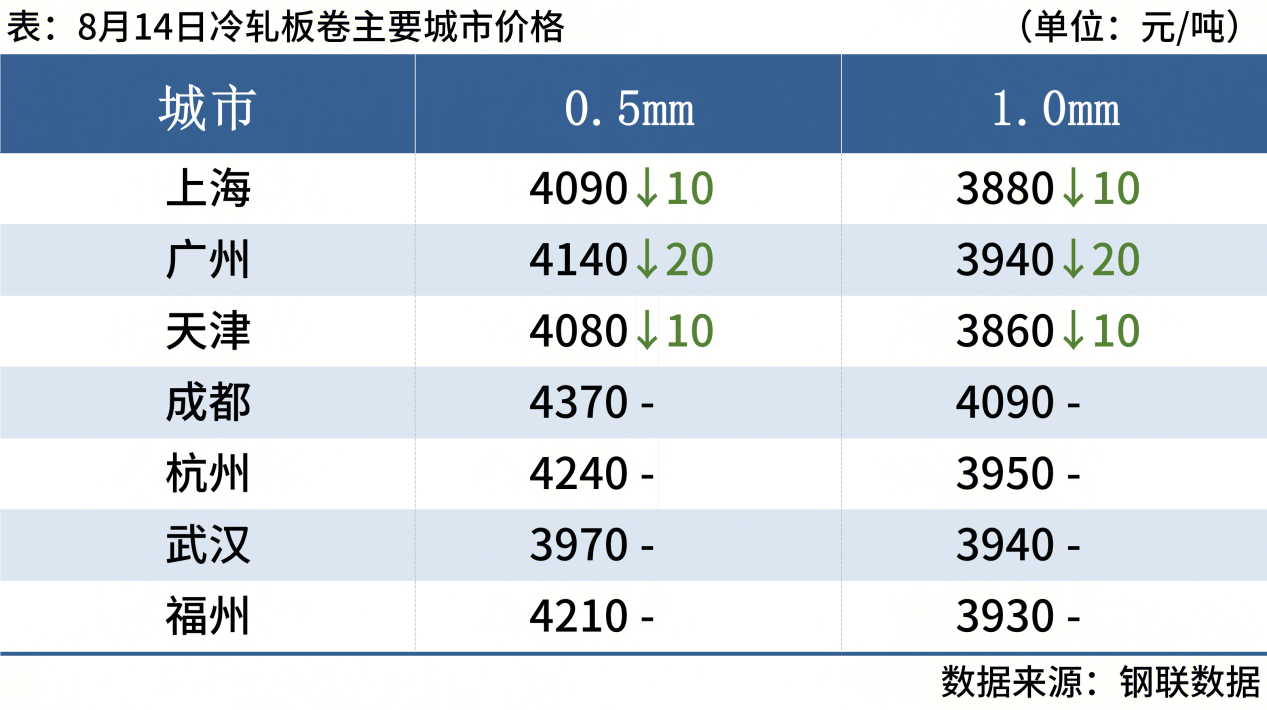 冷軋板卷:8月14日,全國(guó)24個(gè)主要城市1.0mm冷卷均價(jià)3993元/噸,較上個(gè)交易日跌4元/噸。市場(chǎng)情緒較為謹(jǐn)慎,交投活躍度不佳,商家出貨受阻,小幅下調(diào)現(xiàn)貨價(jià)格。本周冷軋板卷整體庫存壓力依舊不大。大部分商家認(rèn)為在維持當(dāng)前較低庫存水平狀態(tài)下,短期內(nèi)冷軋板卷現(xiàn)貨價(jià)格向下調(diào)整空間有限。綜合來看,預(yù)計(jì)15日冷軋價(jià)格或?qū)⒄鹗幷{(diào)整運(yùn)行為主。