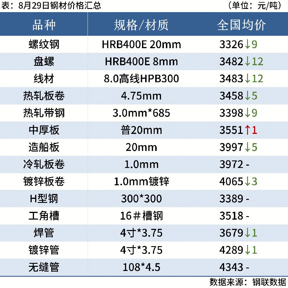螺紋鋼:8月29日,全國(guó)31個(gè)主要城市20mm三級(jí)抗震螺紋鋼均價(jià)3326元/噸,較上個(gè)交易日跌9元/噸。短期來(lái)看,供需基本面矛盾逐步累加,預(yù)計(jì)下周國(guó)內(nèi)建筑鋼材價(jià)格或?qū)⒀永m(xù)偏弱震蕩運(yùn)行態(tài)勢(shì)。