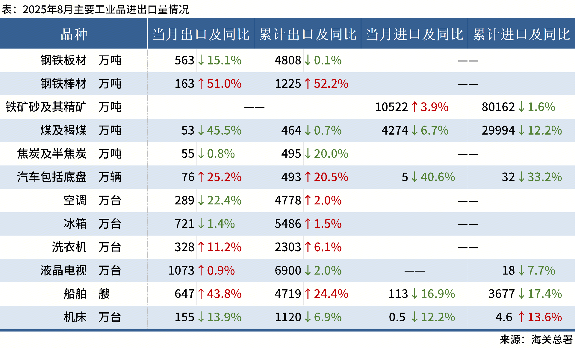 ◎ 海關(guān)總署:8月,中國出口鋼鐵板材563萬噸,同比降15.1%;8月,中國出口棒材163萬噸,同比增51%。其他主要工業(yè)品進出口情況如下: