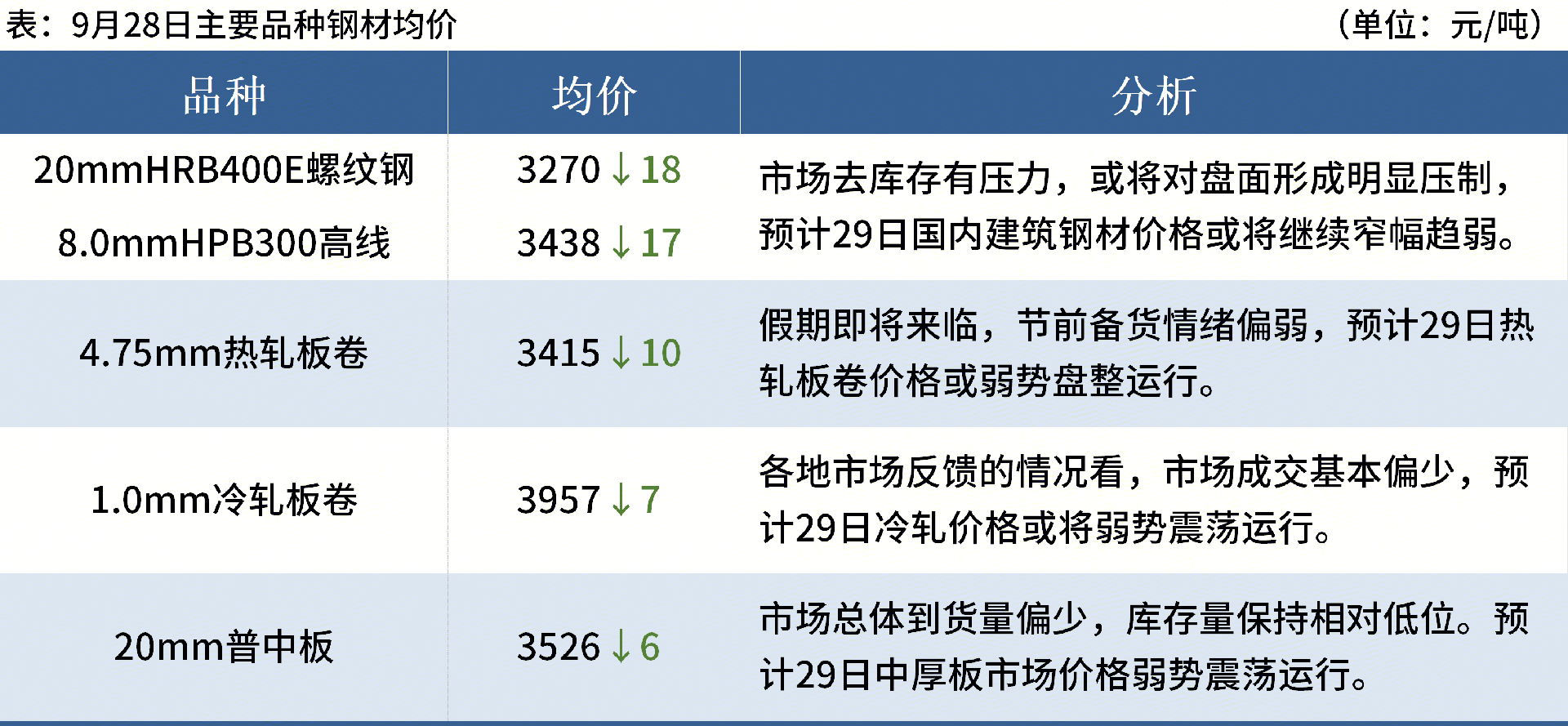 ◎ 9月28日,國(guó)內(nèi)鋼材市場(chǎng)弱勢(shì)下跌,唐山遷安鋼鐵普方坯出廠(chǎng)含稅價(jià)下調(diào)10報(bào)2970元/噸。