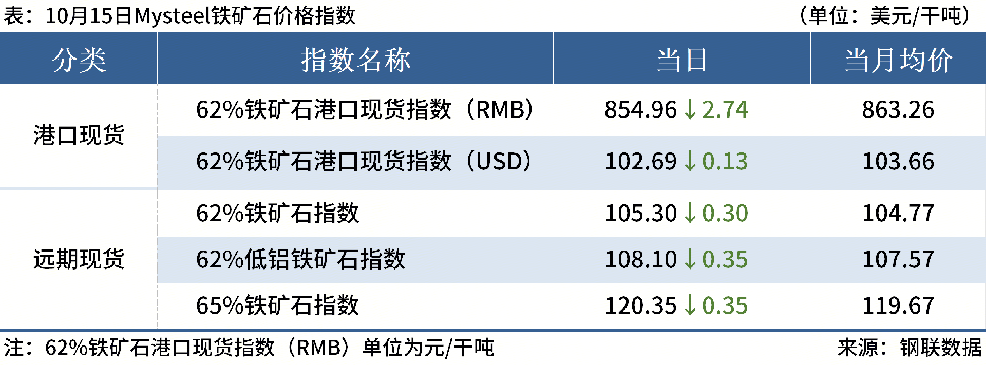 ◎ 10月15日,全國主港鐵礦石成交124.40萬噸,環(huán)比減33.1%;237家主流貿(mào)易商建筑鋼材成交9.14萬噸,環(huán)比減3.4%。