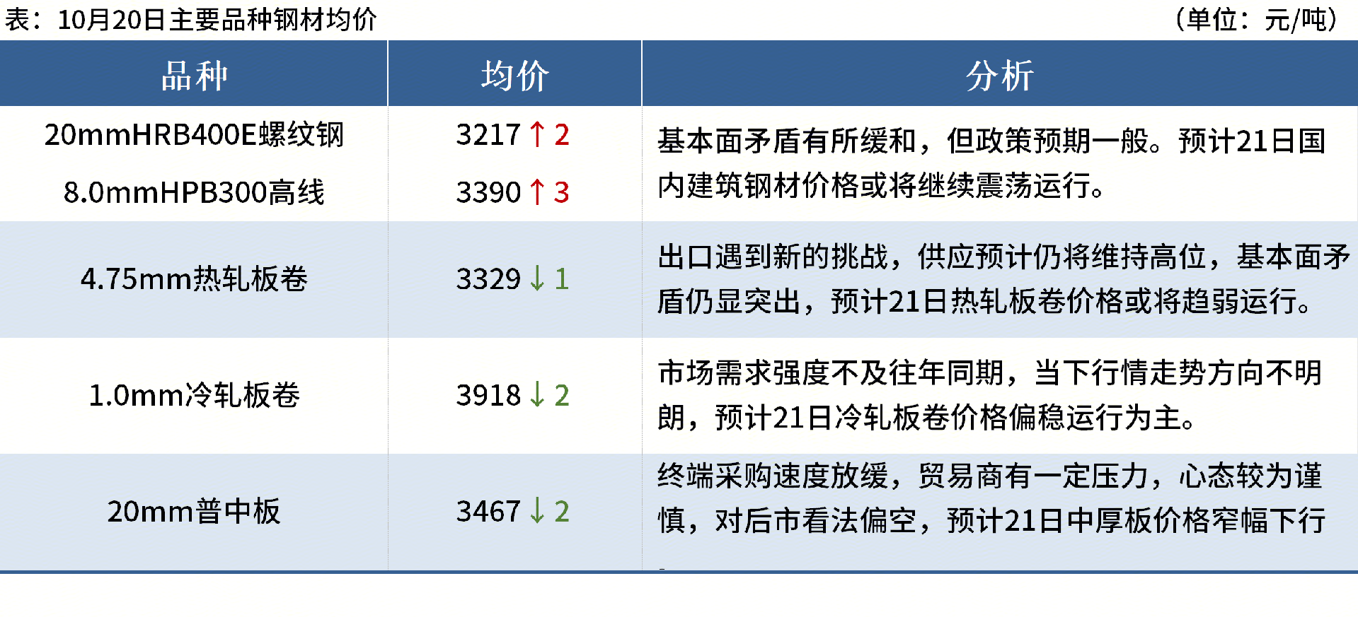 ◎10月20日,中天鋼鐵出臺(tái)10月下旬價(jià)格,螺紋下調(diào)50元/噸,線材盤(pán)螺下調(diào)50元/噸?,F(xiàn)華東螺紋3350元/噸,線材盤(pán)螺3550元/噸。