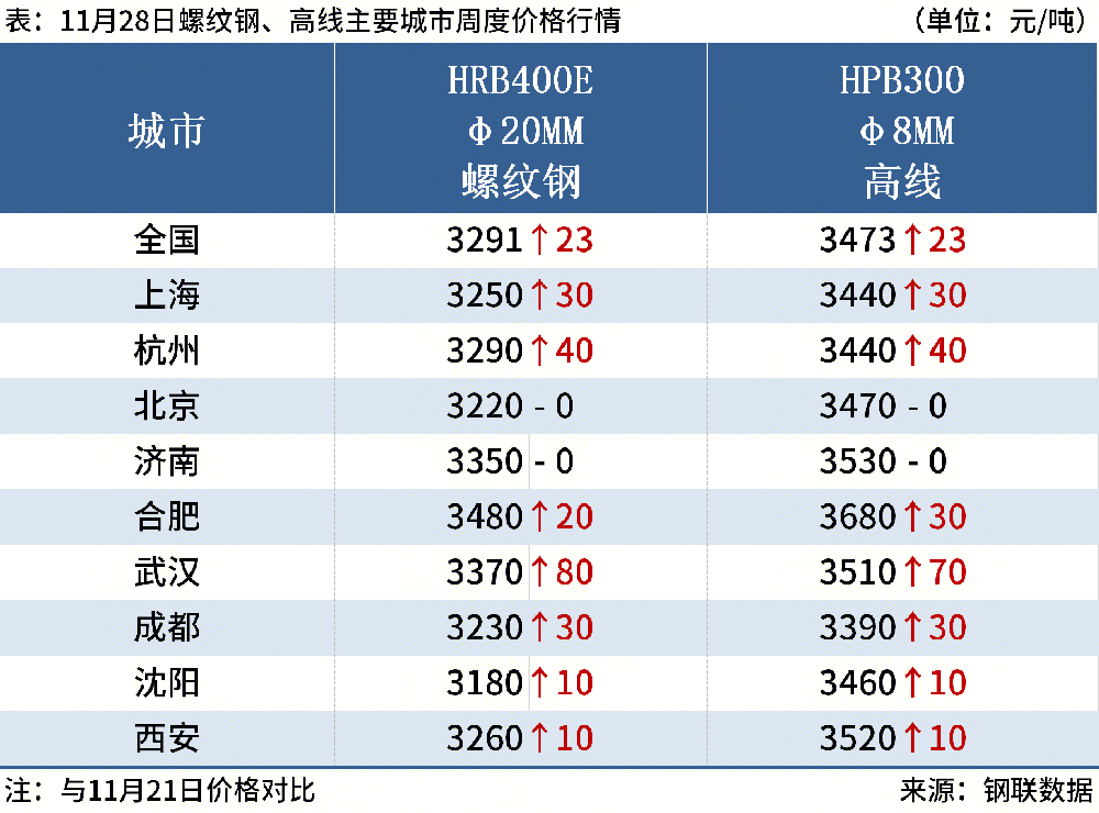 截至11月28日,全國(guó)主要城市20mm三級(jí)抗震螺紋鋼均價(jià)3291元/噸,周環(huán)比上漲23元/噸;8.0mmHPB300高線均價(jià)3473元/噸,周環(huán)比上漲23元/噸。