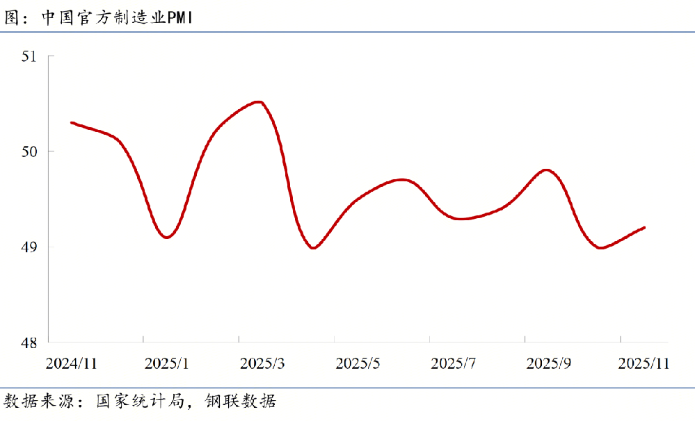 ◎ 國家統(tǒng)計局數(shù)據(jù)顯示,11月份我國制造業(yè)PMI為49.2%,比上月上升0.2個百分點;非制造業(yè)PMI為49.5%,比上月下降0.6個百分點;綜合PMI產(chǎn)出指數(shù)為49.7%,比上月下降0.3個百分點。