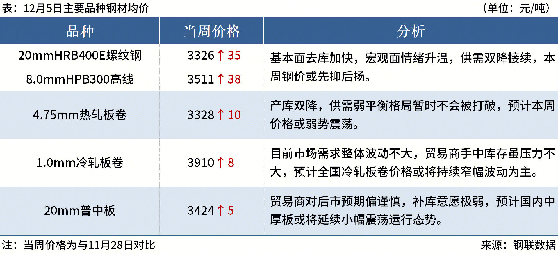 ◎2025年12月1日-5日,全國(guó)螺紋鋼均價(jià)為3326元/噸,周環(huán)比上漲1.06%。供應(yīng)端,螺紋鋼周產(chǎn)量189.31萬(wàn)噸,環(huán)比下降8.14%,庫(kù)存503.81萬(wàn)噸,環(huán)比下降5.21%;需求端,消費(fèi)量216.98萬(wàn)噸,環(huán)比下降4.81%。