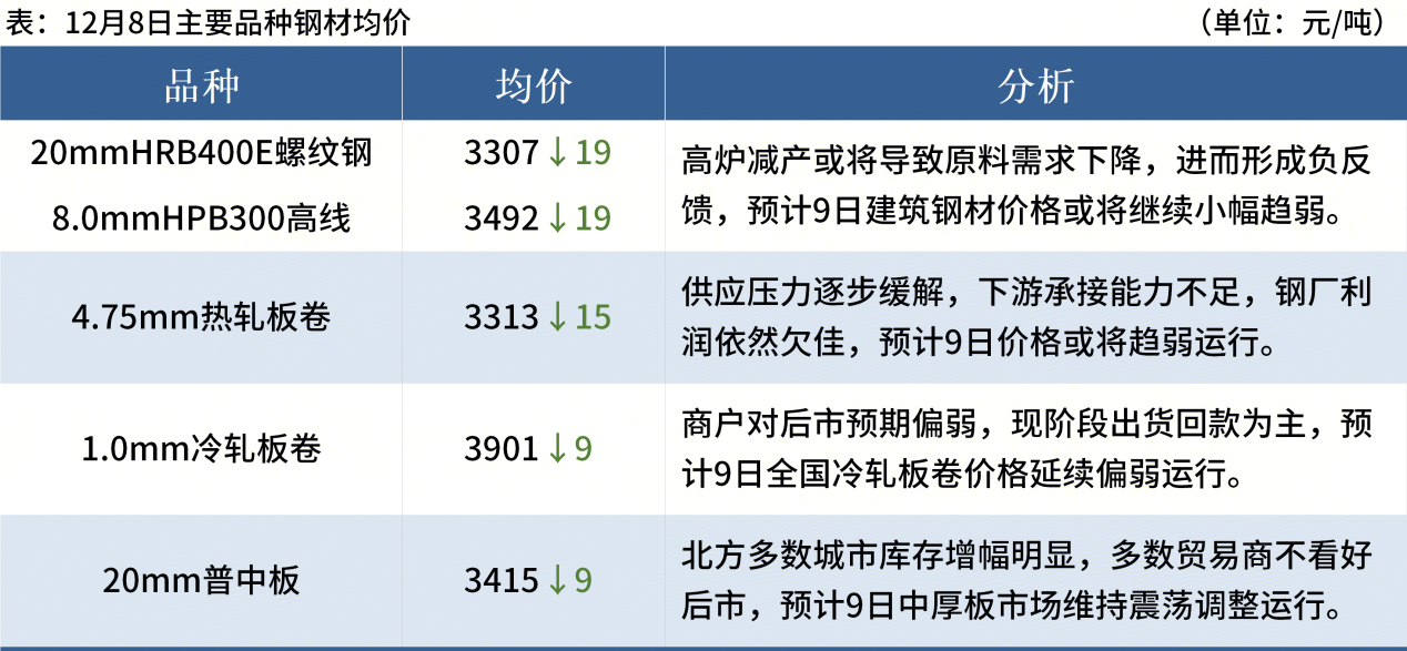 ◎ 四川德勝于12月8日開(kāi)始檢修一座1250m3高爐,預(yù)計(jì)用時(shí)7天,影響螺紋鋼總產(chǎn)量約3萬(wàn)噸。
