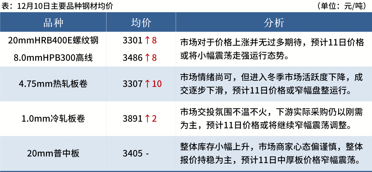 ◎ 12月10日,中天鋼鐵出臺(tái)12月中旬價(jià)格,螺紋鋼、線材、盤螺均上調(diào)50元/噸。華東螺紋鋼3400元/噸、線材盤螺3600元/噸。