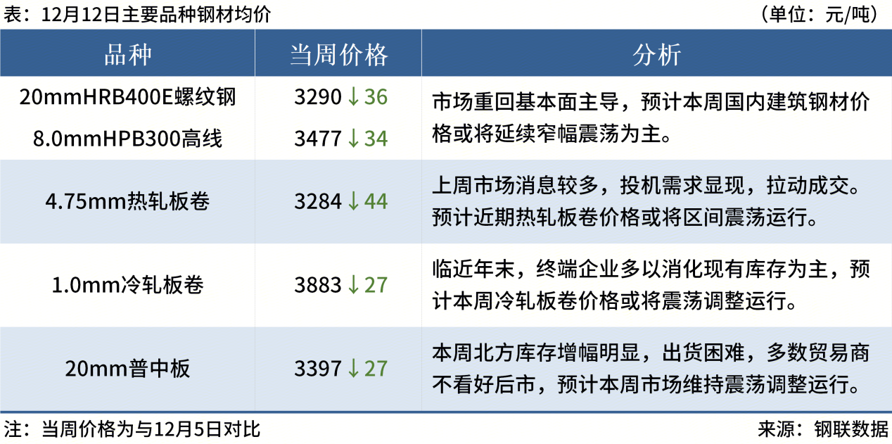 ◎ 12月8日-12月12日,全國螺紋鋼均價為3289元/噸,周環(huán)比下跌1.11%。供應端,螺紋鋼周產(chǎn)量178.78萬噸,庫存479.5萬噸;需求端,消費量203.09萬噸,建材周度成交量49.11萬噸。